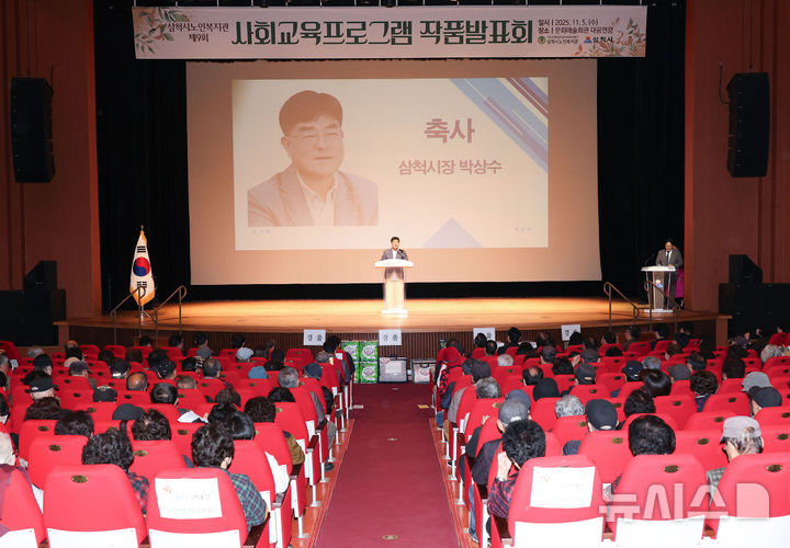 [삼척=뉴시스] 홍춘봉 기자 = 5일 강원 삼척문화예술회관 대공연장에서 삼척시노인복지관(관장 엄기대) 주관으로 제9회 삼척시노인복지관 사회교육프로그램 작품발표회가 개최된 가운데 박상수 삼척시장이 축사를 하고 있다.(사진=삼척시 제공)[email protected]