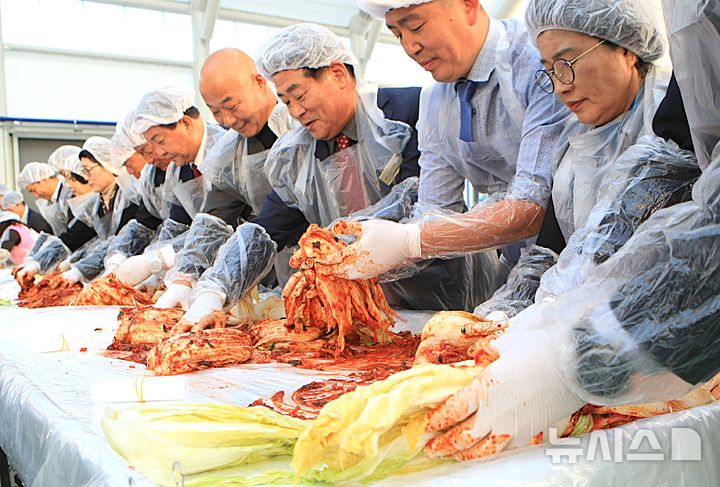 [평창=뉴시스] 이덕화 기자 = 5일 강원 평창군 대표 미식축제인 제8회 평창고랭지김장축제가 개막한 가운데 심재국 군수를 비롯한 내빈들이 김장 체험을 하고 있다. 2025.11.05. [email protected]