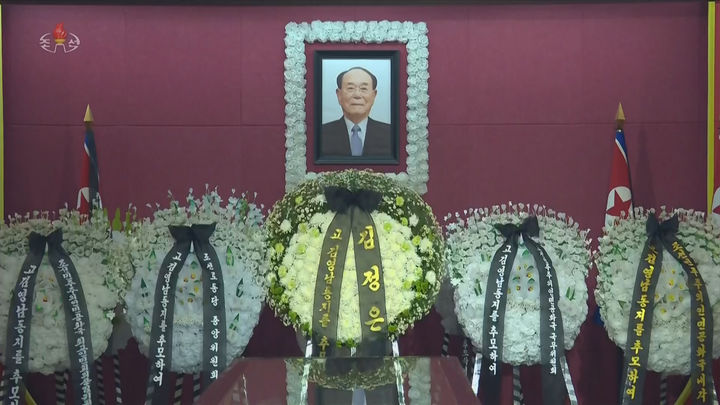 [서울=뉴시스] 북한 조선중앙TV는 지난 4일 당 ,정권,무력기관,성,중앙기관의 간부들이 김영남 전 최고인민회의 상임위원장 빈소를 찾아 조의를 표시했다고 5일 보도했다. 김 전 상임위원장은 암성중독에 의한 다장기부전으로 3일 사망했으며, 장례는 국장으로 치러진다. (사진=조선중앙TV 캡쳐) 2025.11.05. [email protected] *재판매 및 DB 금지