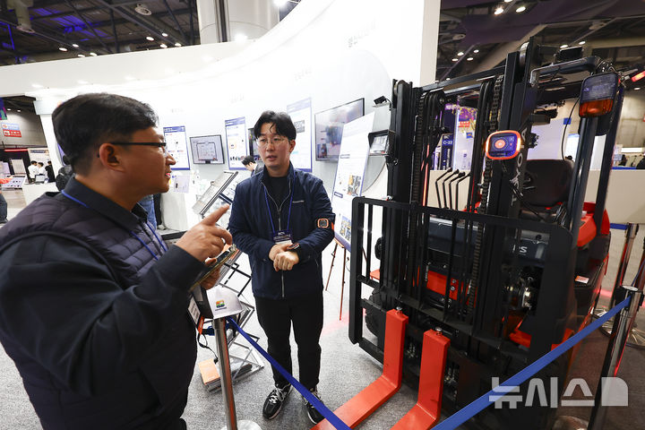 [고양=뉴시스] 김근수 기자 = 5일 경기 고양시 킨텍스에서 열린 2025 스마트 건설·안전·AI 엑스포에서 관람객이 스마트 건설 지게차를 체험해보고 있다. 2025.11.05. [email protected]
