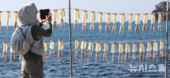 [제주=뉴시스] 우장호 기자 = 맑은 날씨를 보인 5일 오전 제주시 한경면 고산리 차귀도포구에서 오징어가 가을 햇살 아래서 건조되고 있다. 2025.11.05. [email protected]