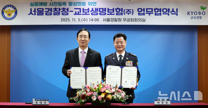 [서울=뉴시스] 홍효식 기자 = 박정보(오른쪽) 서울경찰청장과 조대규 교보생명 대표이사 사장이 5일 서울 종로구 서울경찰청에서 열린 실종예방 사전등록 활성화를 위한 서울경찰청-교보생명보험 업무협약식에 서명한 협약서를 들고 기념촬영하고 있다. 2025.11.05. [email protected]