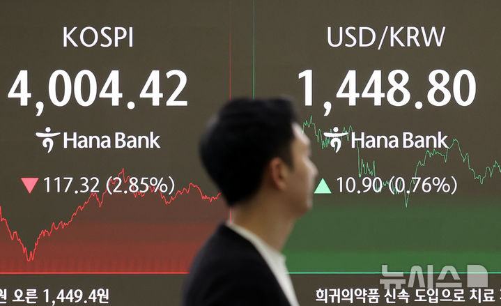 [서울=뉴시스] 이영환 기자 = 코스피가 전 거래일(4121.74)보다 117.32포인트(2.85%) 내린 4004.42에 마감한 5일 오후 서울 중구 하나은행 딜링룸 전광판에 종가가 표시되어 있다.