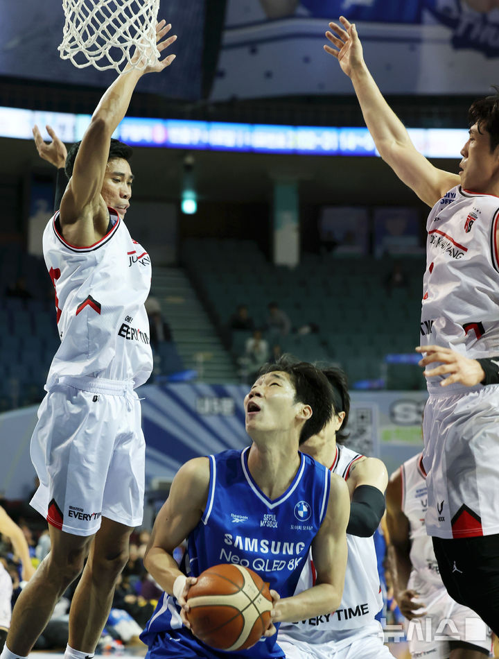 [서울=뉴시스] 홍효식 기자 = 5일 서울 송파구 잠실실내체육관에서 열린 2025-2026 KBL 프로농구 서울 삼성과 안양 정관장의 경기, 삼성 이원석이 슛을 망설이고 있다. 2025.11.05. [email protected]