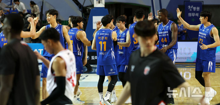 [서울=뉴시스] 홍효식 기자 = 5일 서울 송파구 잠실실내체육관에서 열린 2025-2026 KBL 프로농구 서울 삼성과 안양 정관장의 경기, 89-75로 승리한 삼성 선수들이 기뻐하고 있다. 2025.11.05. [email protected]