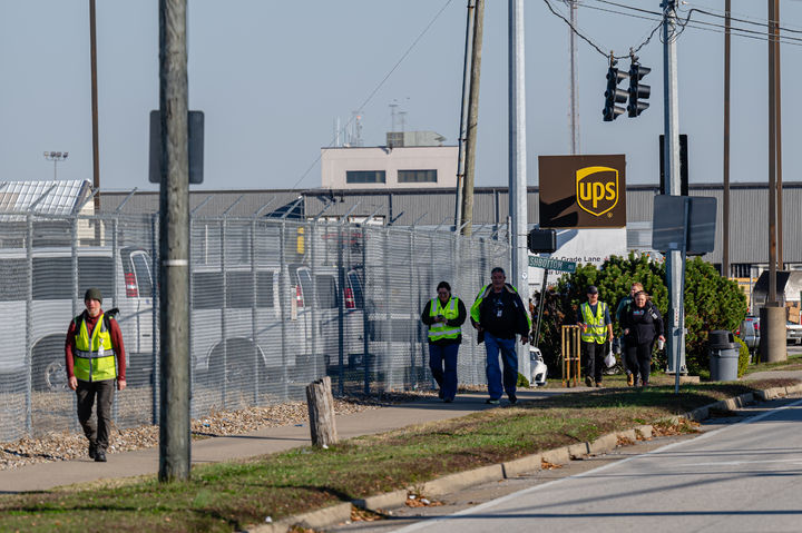 [루이빌=AP/뉴시스] 5일(현지 시간) 미 켄터키주 루이빌 무하마드 알리 국제공항에서 UPS 직원들이 UPS 부지 출입구로 들어가고 있다. 지난 4일 하와이주 호눌룰루로 향하던 UPS 화물기가 이륙 직후 추락해 지금까지 어린이와 승무원 포함 최소 12명이 사망하고 15명이 다쳤으며 16명이 실종된 것으로 알려졌다. 2025.11.06.