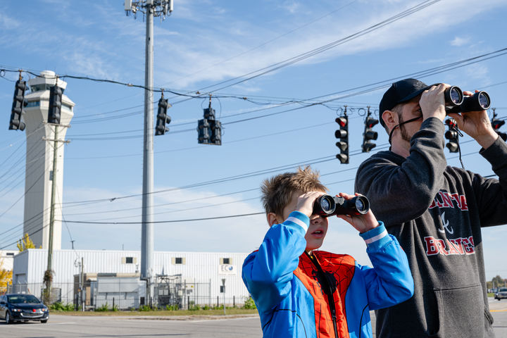 [루이빌=AP/뉴시스] 5일(현지 시간) 미 켄터키주 루이빌 무하마드 알리 국제공항 인근에서  한 부자가 쌍안경으로 UPS 2976편 화물기 추락 현장을 살펴보고 있다. 지난 4일 하와이주 호놀룰루로 향하던 UPS 소속 화물기가 이륙 직후 추락해 지금까지 어린이와 승무원 포함 최소 12명이 사망하고 15명이 다쳤으며 16명이 실종된 것으로 알려졌다. 2025.11.06.