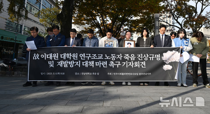 [광주=뉴시스] 이영주 기자 = 6일 오전 광주 북구 전남대학교 후문에서 민주사회를위한변호사모임 광주지부의 전남대 교수 갑질 사건 진상규명 촉구 기자회견이 열리고 있다. 2025.11.06. [email protected]