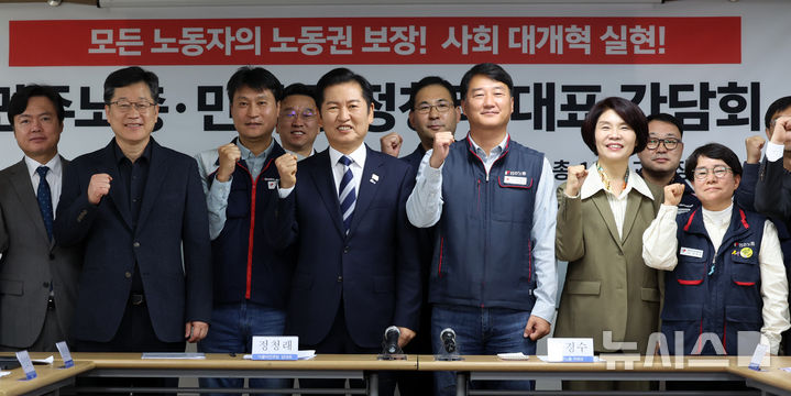 [서울=뉴시스] 이영환 기자 = 정청래 더불어민주당 대표와 양경수 민주노총 위원장 등이 6일 오전 서울 중구 민주노총에서 열린 민주노총-민주당 간담회에서 기념촬영을 하고 있다. 2025.11.06. [email protected]