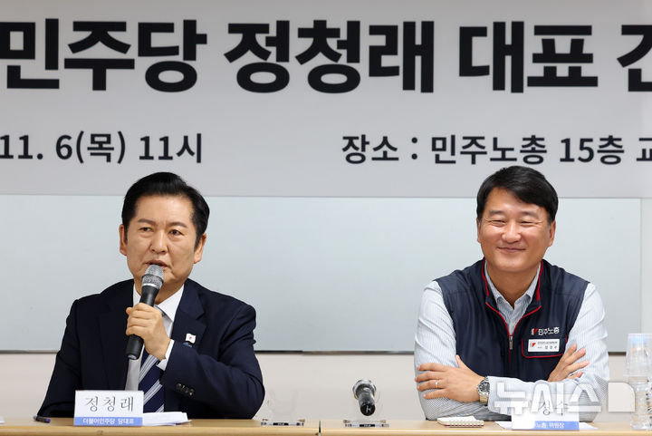 [서울=뉴시스] 이영환 기자 = 정청래 더불어민주당 대표가 6일 오전 서울 중구 민주노총에서 열린 민주노총-민주당 간담회에서 발언을 하고 있다. 2025.11.06. [email protected]