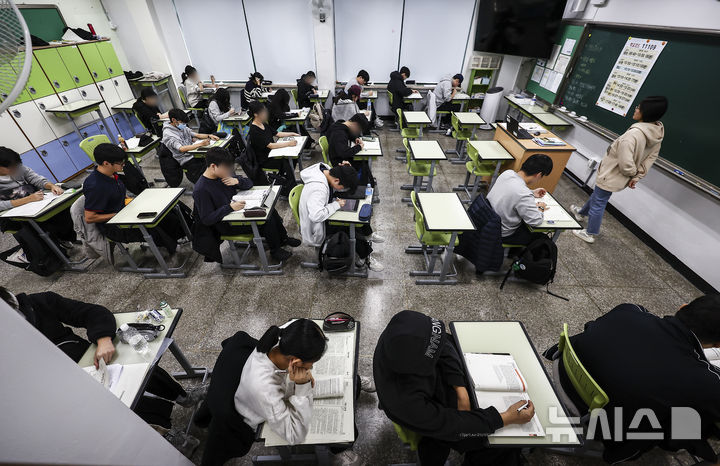 [서울=뉴시스] 김근수 기자 = 2026학년도 대학수학능력시험을 일주일 앞둔 6일 서울 광진구 광남고등학교 3학년 교실에서 수험생들이 공부를 하고 있다. 2025.11.06. [email protected]