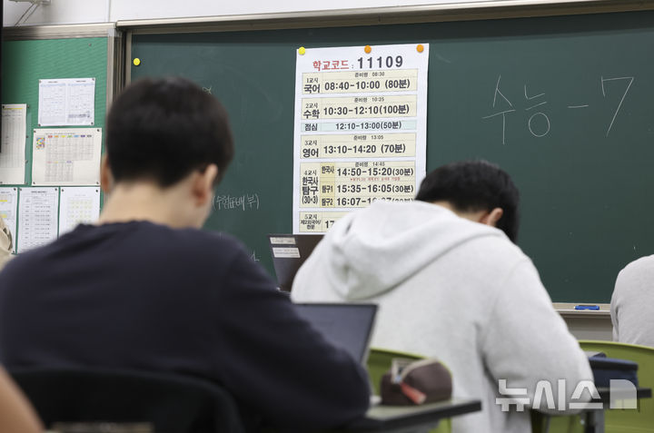 [서울=뉴시스] 김근수 기자 = 2026학년도 대학수학능력시험을 일주일 앞둔 6일 서울 광진구 광남고등학교 3학년 교실에서 수험생들이 공부를 하고 있다. 2025.11.06. [email protected]