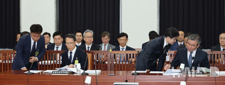 [서울=뉴시스] 국회사진기자단 = 유재성 경찰청장 직무대행과 박성주 국가수사본부장이 6일 서울 여의도 국회 정보위원회에서 열린 경찰청 국정감사에 출석하고 있다. 2025.11.06. [email protected]