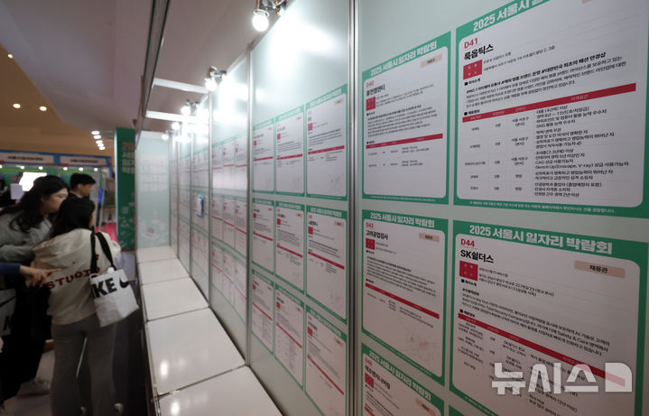 [서울=뉴시스] 이영환 기자 = 6일 오후 서울 중구 동대문디자인플라자(DDP)에서 열린 2025 서울시 일자리 박람회에서 구직자들이 채용공고를 살펴보고 있다. 2025.11.06. [email protected]