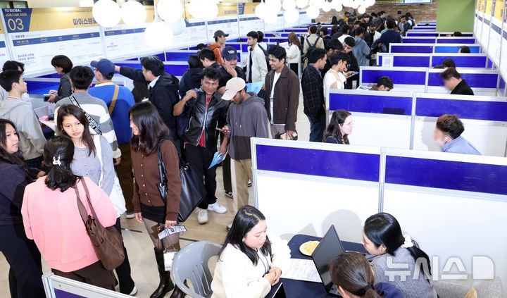 [부산=뉴시스] 하경민 기자 = 글로벌 채용박람회(TU Global Job Fair 2025)가 열린 6일 부산 남구 동명대에서 외국인 유학생들이 기업 인사담당자와 채용상담을 하고 있다.