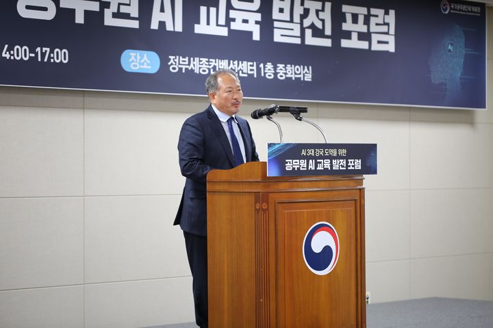 [서울=뉴시스] 임채원 국가공무원인재개발원장이 6일 세종시 정부세종컨벤션센터에서 열린 'AI 3대 강국 도약을 위한 공무원 AI 교육 발전 포럼'에서 개회사를 하고 있다. (사진=국가공무원인재개발원 제공) 2025.11.06. [email protected] *재판매 및 DB 금지