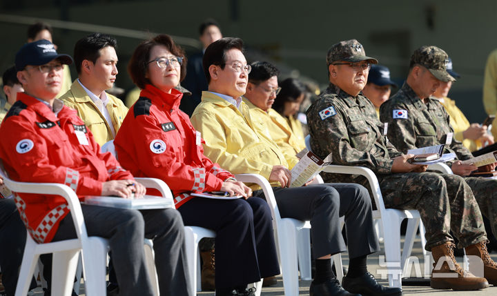 [원주=뉴시스] 고범준 기자 = 이재명 대통령이 6일 강원도 원주시 산림항공본부에서 열린 산불진화 관·군 합동훈련을 참관하고 있다. 2025.11.06. [email protected]