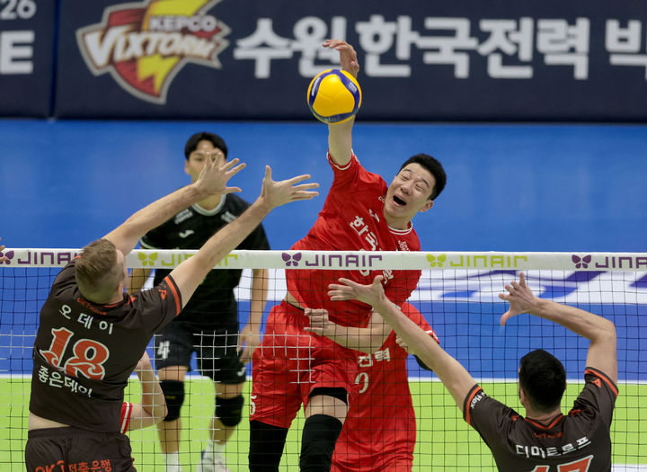 [서울=뉴시스] 김진아 기자 = 6일 수원실내체육관에서 열린 진에어 2025-26 V-리그 프로배구대회 한국전력과 OK저축은행과의 경기, 한국전력 신영석이 공격하고 있다. (사진=한국전력 배구단 제공) 2025.11.06. [email protected] *재판매 및 DB 금지