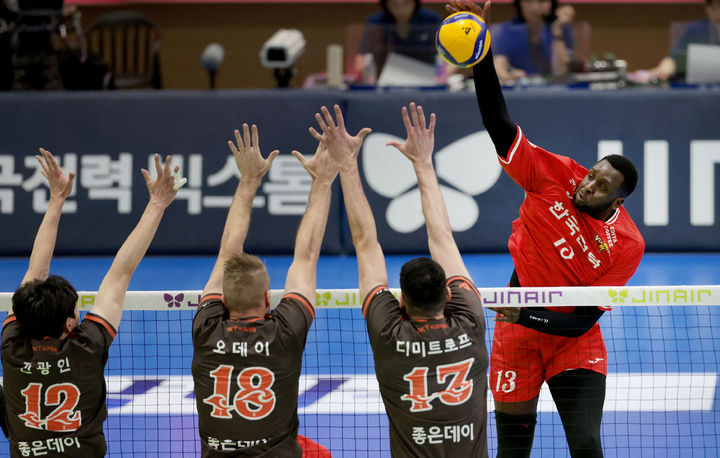 [서울=뉴시스] 김진아 기자 = 6일 수원실내체육관에서 열린 진에어 2025-26 V-리그 프로배구대회 한국전력과 OK저축은행과의 경기, 한국전력 베논이 공격하고 있다. (사진=한국전력 배구단 제공) 2025.11.06. [email protected] *재판매 및 DB 금지