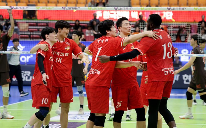 [서울=뉴시스] 김진아 기자 = 6일 수원실내체육관에서 열린 진에어 2025-26 V-리그 프로배구대회 한국전력과 OK저축은행과의 경기, 한국전력 선수들이 세트 점수 3:2로 승리 후 환호하고 있다. (사진=한국전력 배구단 제공) 2025.11.06. [email protected] *재판매 및 DB 금지