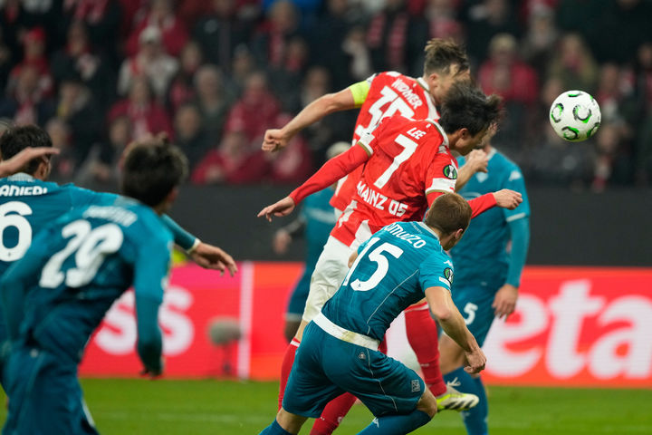 [마인츠=AP/뉴시스] FSV 마인츠 05(독일)의 이재성(7)이 6일(현지 시간) 독일 마인츠의 메바 아레나에서 열린 유럽축구연맹(UEFA) 콘퍼런스리그(UECL) 리그 페이즈 3차전 피오렌티나(이탈리아)와 경기 후반 추가시간 극장 결승 골을 넣고 있다. 이재성은 37분을 소화하며 1골 1도움으로 팀의 2-1 승리를 이끌었다. 2025.11.07.
