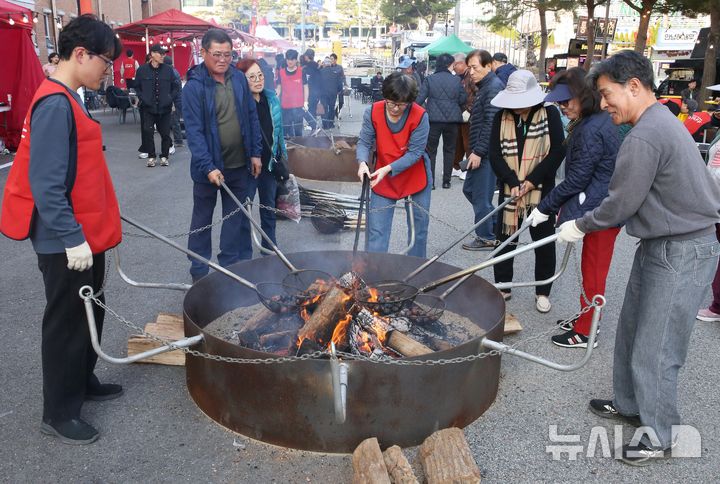 [괴산=뉴시스] 서주영 기자 = 7일 충북 괴산군 유기농엑스포광장에 열린 '2025 괴산김장축제'에서 시민들이 구워먹기 체험존에서 밤을 굽고 있다. 2025.11.07. [email protected]