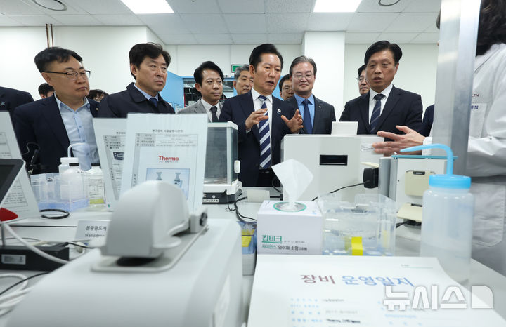 [청주=뉴시스] 고승민 기자 = 정청래 더불어민주당 대표가 7일 K-바이오 세계 도약을 위한 정책간담회 차 충북 청주 오송첨단의료산업진흥재단 신약개발지원센터를 방문, 실험 장비 등을 살피고 있다. 2025.11.07. [email protected]