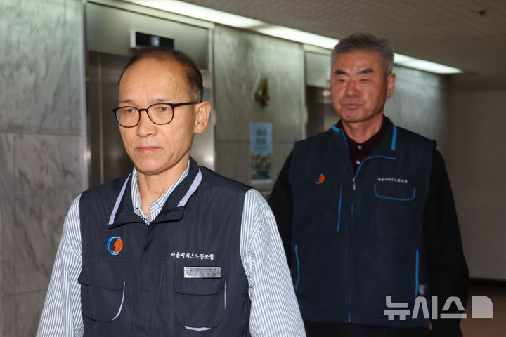 [서울=뉴시스] 권창회 기자 = 백가인 서울시버스노동조합 상임부위원장을 비롯한 조합원들이 7일 서울 송파구 서울시버스운송사업조합에서 열린 중앙노사교섭회의에 참석하기 위해 이동하고 있다.