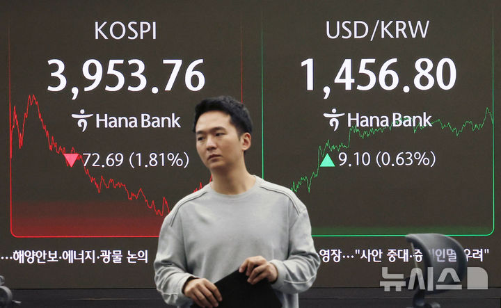 코스피는 전 거래일(4026.45)보다 72.69포인트(1.81%) 내린 3953.76에 코스닥 지수는 전 거래일(898.17)보다 21.36포인트(2.38%) 하락한 876.81에 거래를 마쳤다. 서울 외환시장에서 원·달러 환율은 전 거래일(1447.7원)보다 9.2원 오른 1456.9원에 주간 거래를 마감했다. 2025.11.07. [email protected]