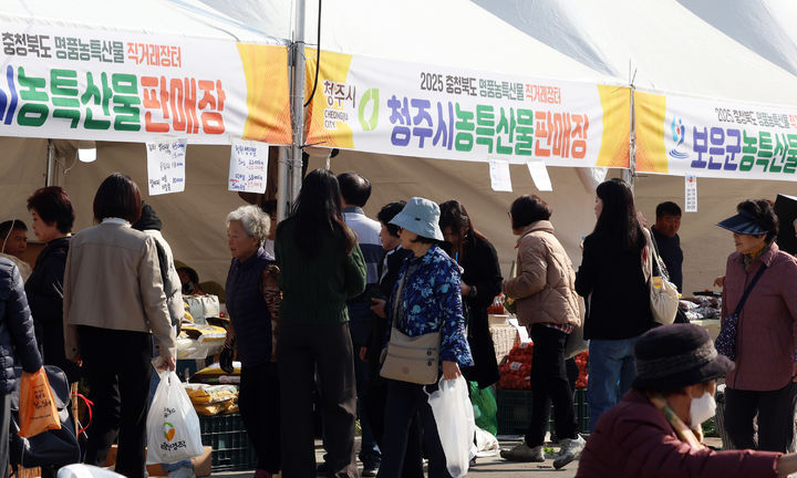 [서울=뉴시스] 7일 오후 서울 노원구 등나무문화공원에서 열린 ‘2025 충북 직거래 장터’에 시민들이 지역 농산물을 구매하고 있다.  행사는 11월 7일부터 9일까지 3일간 열리며, 오전 10시부터 오후 5시까지 등나무문화공원에서 운영된다. 마지막 날인 9일은 오후 4시에 종료된다. 행사기간 동안 충북 각 지역의 우수한 농·특산물 60여 품목을 현장에서 구매할 수 있다. (사진=노원구청 제공)  2025.11.07. [email protected] *재판매 및 DB 금지