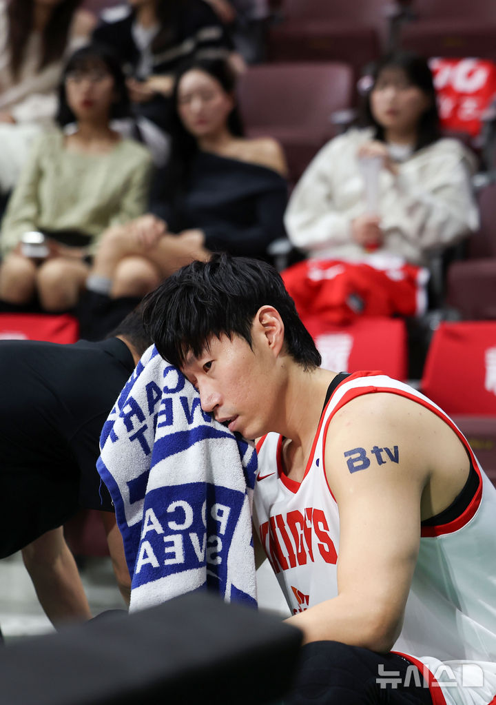 [안양=뉴시스] 김선웅 기자 = 7일 경기 안양시 정관장 아레나에서 열린 2025-2026 프로농구 안양 정관장 vs 서울 SK의 경기, .SK 오세근이 경기 중 부상을 입고 벤치에 앉아 치료를 하고 있다. 2025.11.07. [email protected]