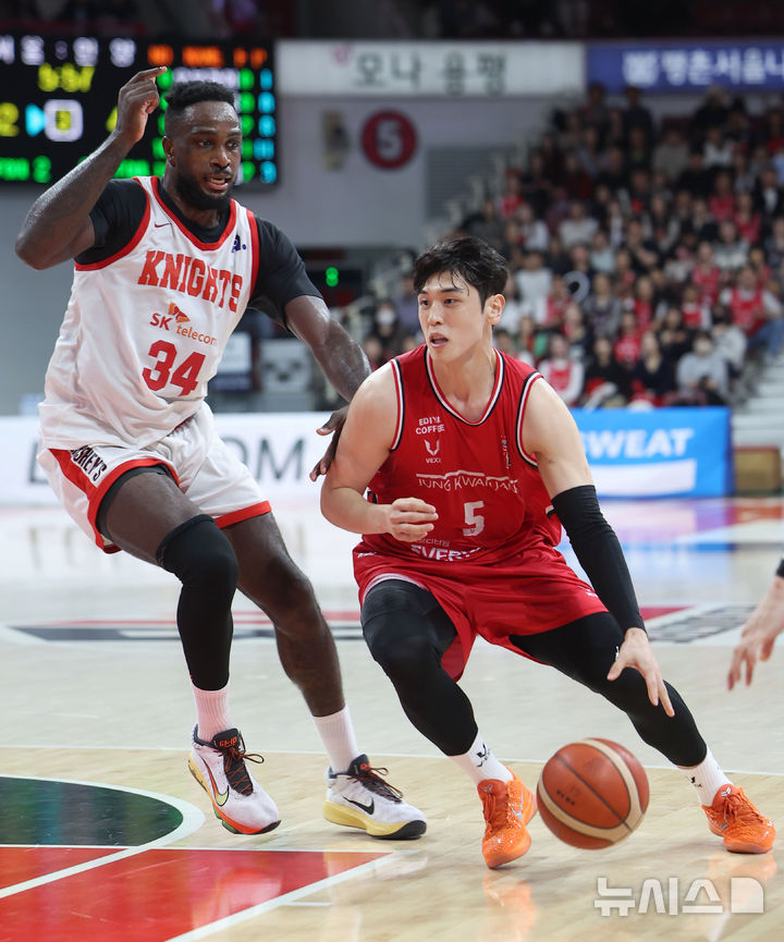 [안양=뉴시스] 김선웅 기자 = 7일 경기 안양시 정관장 아레나에서 열린 2025-2026 프로농구 안양 정관장 vs 서울 SK의 경기, 정관장 변준형이 골대를 향해 드리블하고 있다. 2025.11.07. [email protected]