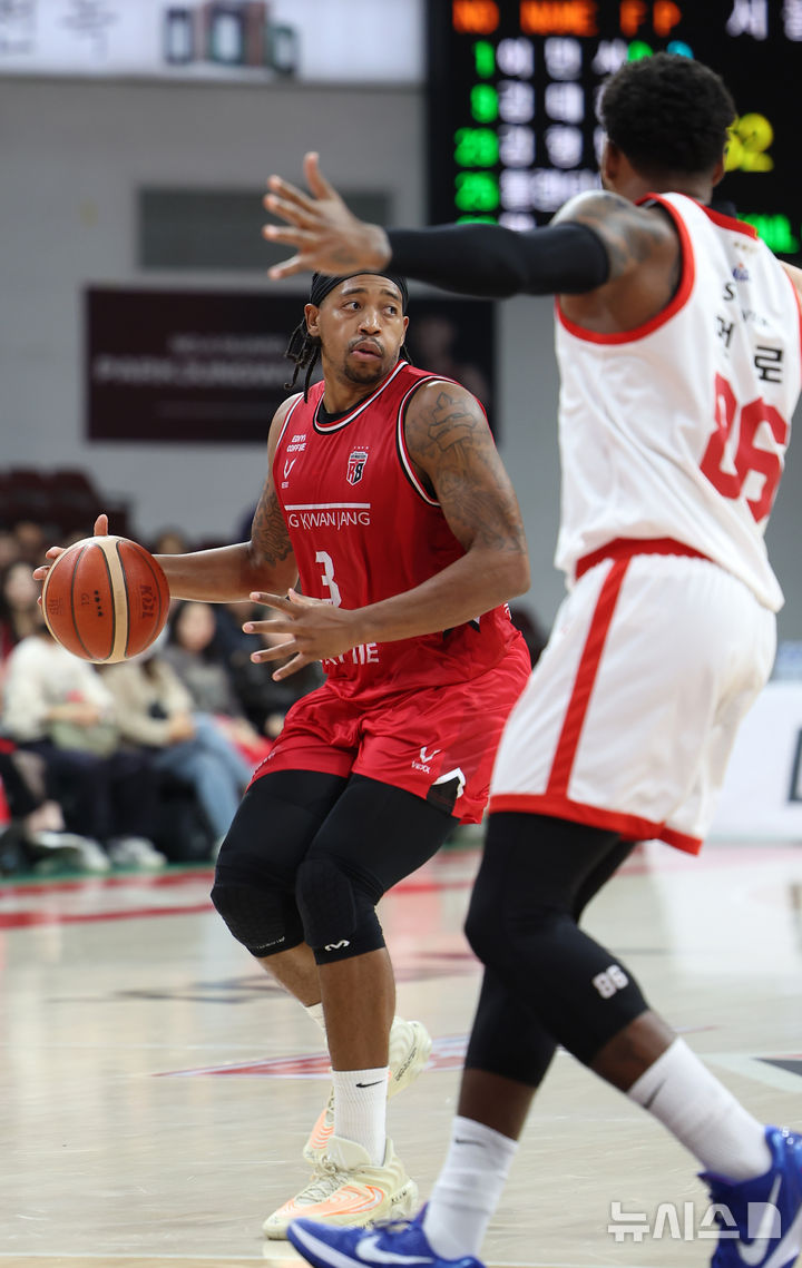 [안양=뉴시스] 김선웅 기자 = 7일 경기 안양시 정관장 아레나에서 열린 2025-2026 프로농구 안양 정관장 vs 서울 SK의 경기, 정관장 워싱턴이 돌파를 시도하고 있다. 2025.11.07. [email protected]