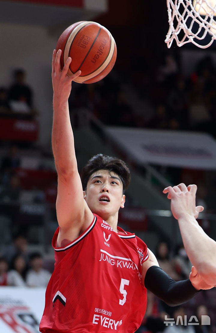 [안양=뉴시스] 김선웅 기자 = 7일 경기 안양시 정관장 아레나에서 열린 2025-2026 프로농구 안양 정관장 vs 서울 SK의 경기, 정관장 변준형이 레이업슛을 하고 있다. 2025.11.07. [email protected]