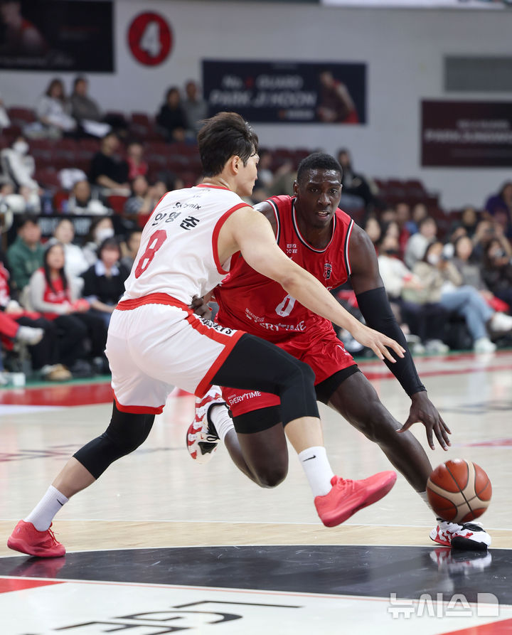 [안양=뉴시스] 김선웅 기자 = 7일 경기 안양시 정관장 아레나에서 열린 2025-2026 프로농구 안양 정관장 vs 서울 SK의 경기, 정관장 조니 오브라이언트가 SK 안영준의 수비를 피해 드리블하고 있다. 2025.11.07. [email protected]