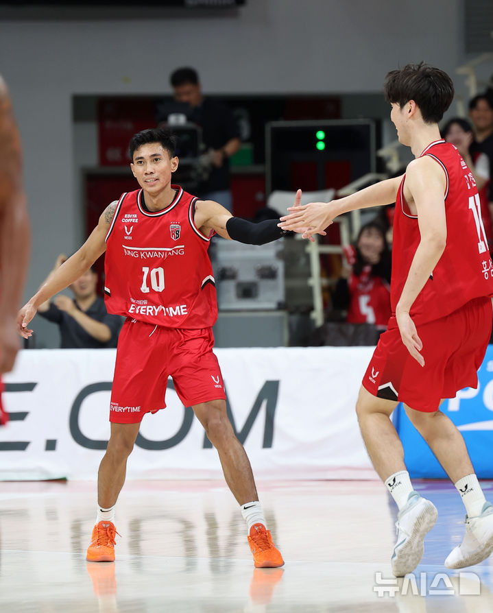 [안양=뉴시스] 김선웅 기자 = 7일 경기 안양시 정관장 아레나에서 열린 2025-2026 프로농구 안양 정관장 vs 서울 SK의 경기, 정관장 렌즈 아반도와 김경원이 하이파이브를 하고 있다. 2025.11.07. [email protected]