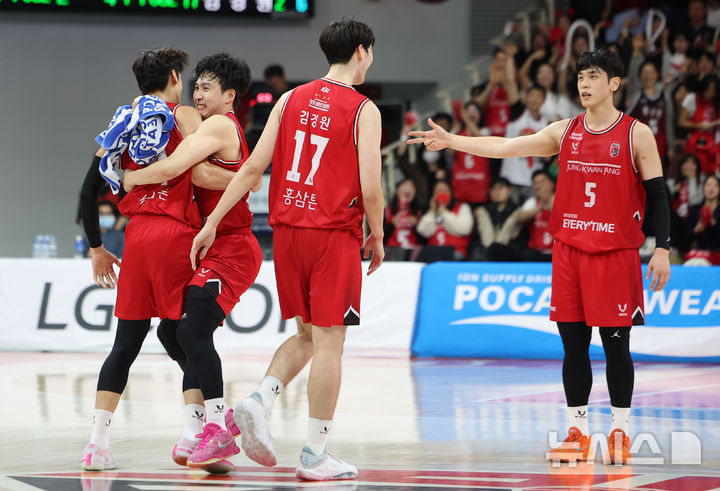 [안양=뉴시스] 김선웅 기자 = 7일 경기 안양시 정관장 아레나에서 열린 2025-2026 프로농구 안양 정관장 vs 서울 SK의 경기, 정관장 선수들이 점수에 앞서가는 중 타임아웃때 코트로 복귀하며 기뻐하고 있다. 2025.11.07. [email protected]