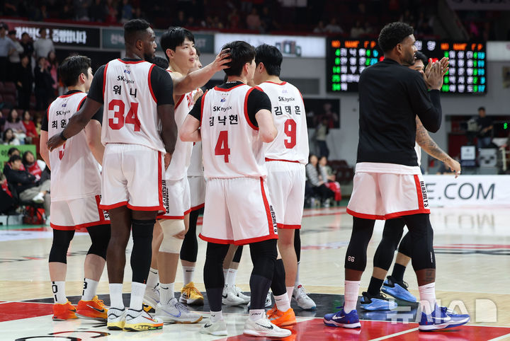 [안양=뉴시스] 김선웅 기자 = 7일 경기 안양시 정관장 아레나에서 열린 2025-2026 프로농구 안양 정관장 vs 서울 SK의 경기, 68-66로 승리를 거둔 서울 SK 선수들이 기뻐하고 있다. 2025.11.07. [email protected]