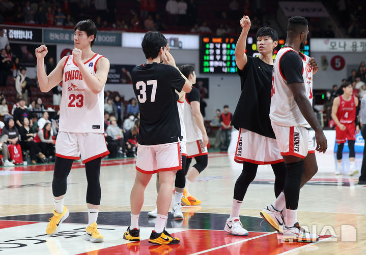 [안양=뉴시스] 김선웅 기자 = 7일 경기 안양시 정관장 아레나에서 열린 2025-2026 프로농구 안양 정관장 vs 서울 SK의 경기, 68-66로 승리를 거둔 서울 SK 선수들이 기뻐하고 있다. 2025.11.07. [email protected]