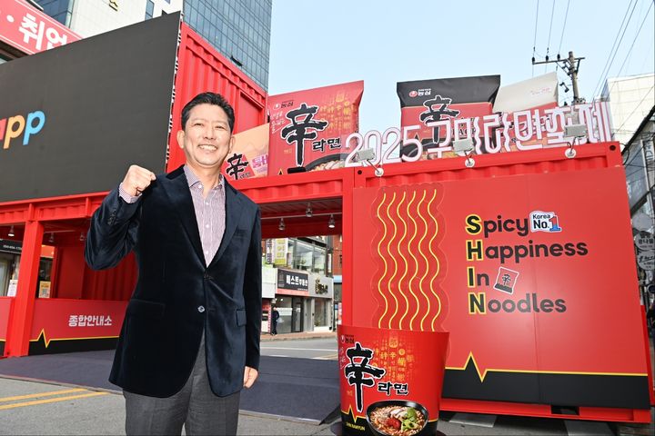 [구미=뉴시스] 박홍식 기자 = 김장호 경북 구미시장이 7일 오후 구미역 일원에서 열린 '2025 구미라면축제' 홍보관 앞에서 파이팅을 외치고 있다. 오는 9일까지 열리는 올해 축제는 셰프들이 갓 튀긴 25가지 창의적 요리를 맛볼 수 있다. (사진=구미시 제공) 2025.11.08 [email protected]