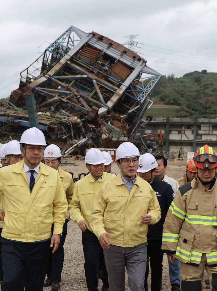 [서울=뉴시스] 이영환 기자 = 김민석 국무총리가 8일 보일러 타워 해체 작업 중 붕괴로 인한 작업자 매몰사고가 발생한 울산화력발전소 현장을 살펴보고 있다.(사진=총리실 제공)  2025.11.08. [email protected]
