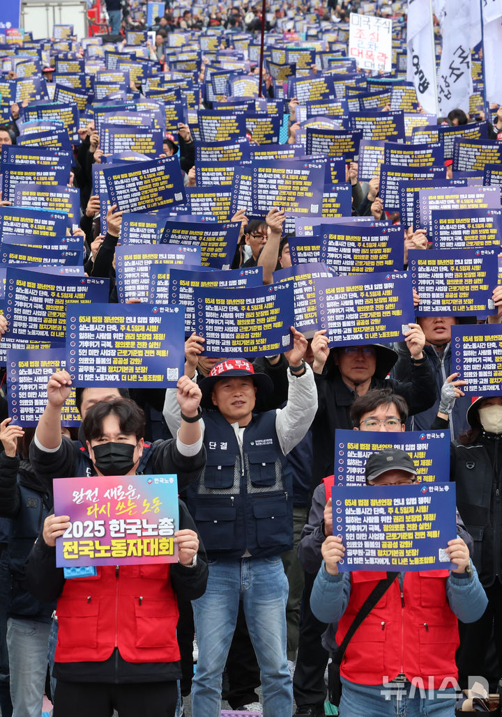 [서울=뉴시스] 이영환 기자 = 8일 오후 서울 영등포구 여의대로에서 열린 2025 한국노총 전국노동자대회에서 참석자들이 구호를 외치고 있다. 2025.11.08. [email protected]