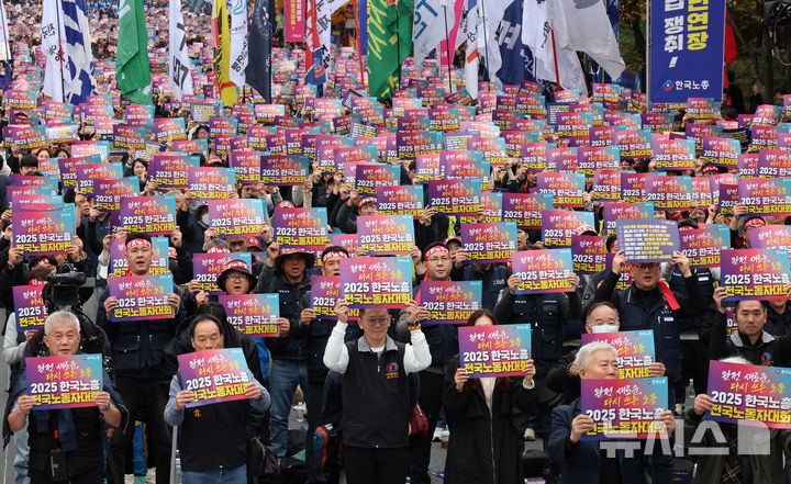 [서울=뉴시스] 이영환 기자 = 8일 오후 서울 영등포구 여의대로에서 열린 2025 한국노총 전국노동자대회에서 참석자들이 구호를 외치고 있다. 2025.11.08. [email protected]
