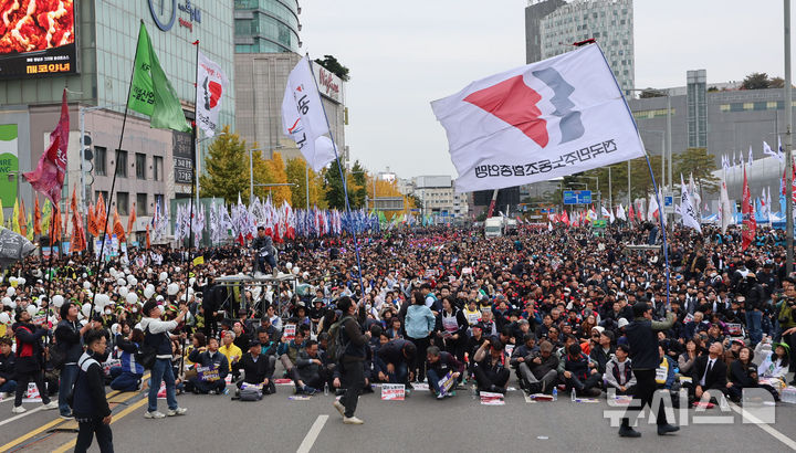 [서울=뉴시스] 권창회 기자 = 8일 서울 중구 동대문디자인플라자(DDP) 인근에서 열린 '전태일 열사 정신계승 2025 전국노동자대회'에서 깃발 입장식이 거행되고 있다. 2025.11.08. [email protected]
