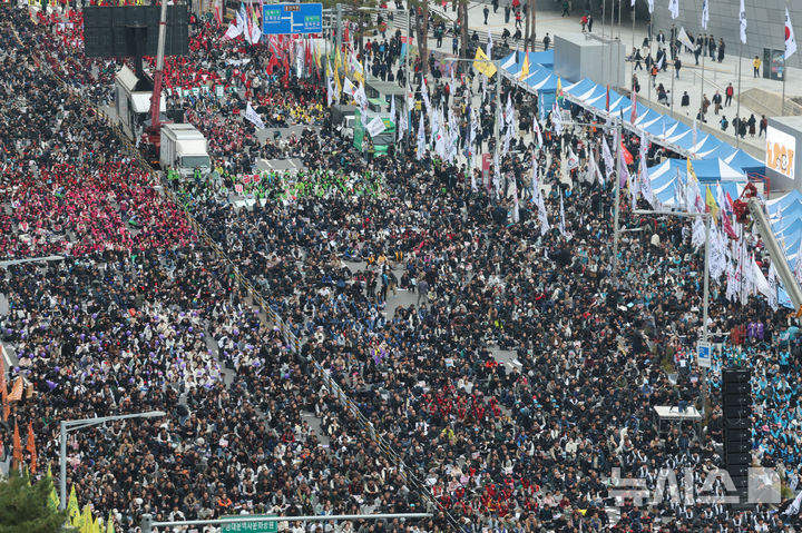 [서울=뉴시스] 권창회 기자 = 8일 서울 중구 동대문디자인플라자(DDP) 인근에서 '전태일 열사 정신계승 2025 전국노동자대회'가 열리고 있다. 2025.11.08. [email protected]