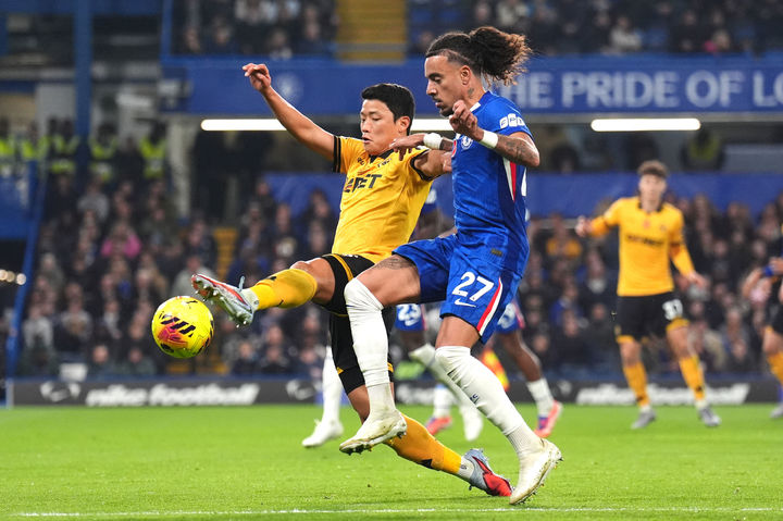 [런던=AP/뉴시스] 울버햄프턴 원더러스의 황희찬(왼쪽)이 8일(현지 시간) 영국 런던의 스탬퍼드 브리지에서 열린 2025-26 EPL 11라운드 첼시와 경기 중 공을 다투고 있다. 황희찬은 70분을 소화했고, 울버햄프턴은 0-3으로 완패해 4연패에 빠졌다. 2025.11.09.