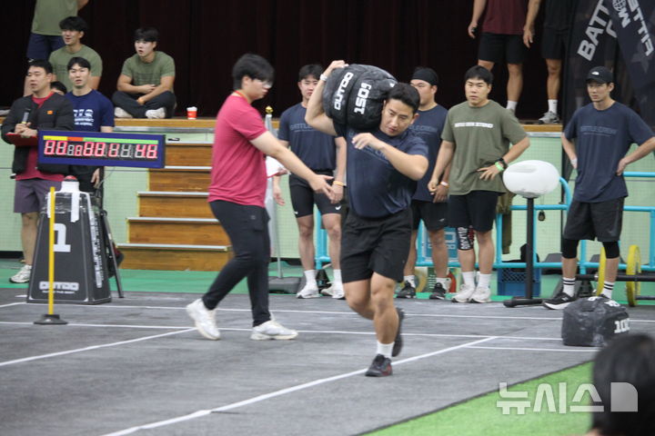 [광명=뉴시스] 최영민 기자=9일 경기도 광명시민체육관에서 열린 배틀크루 챔피언십 둘째 날 경기에서 한 크루원이 '샌드백 캐리' 경기를 진행하고 있다. 2025.11.09 [email protected]