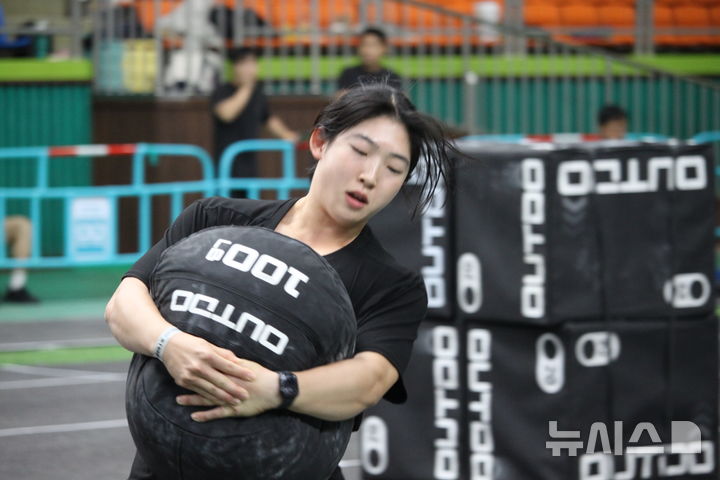 [광명=뉴시스] 최영민 기자=9일 경기도 광명시민체육관에서 열린 배틀크루 챔피언십 둘째 날 여성부(플레어리그) 경기에 참가한 크루원이 샌드백 캐리 종목을 진행하고 있다. 2025.11.09 [email protected]