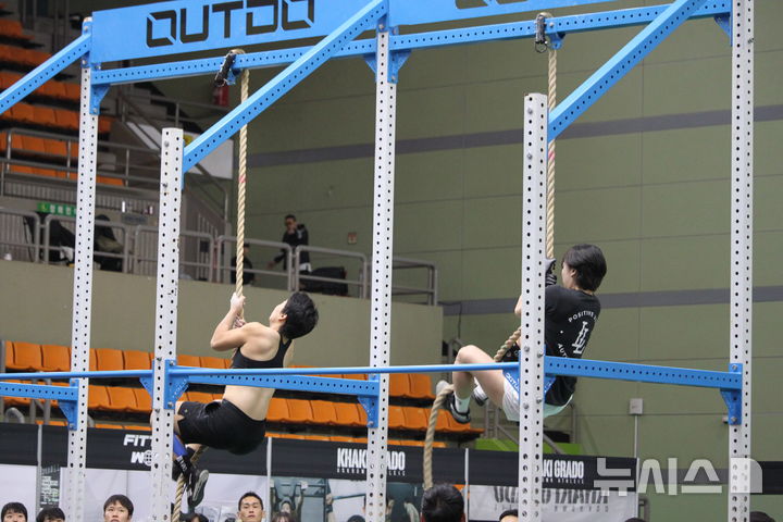 [광명=뉴시스] 최영민 기자=9일 경기도 광명시민체육관에서 열린 배틀크루 챔피언십 둘째 날 플레어리그(여성부)에 참가한 크루원들이 밧줄 오르기 종목을 진행하고 있다. 2025.11.09 [email protected]