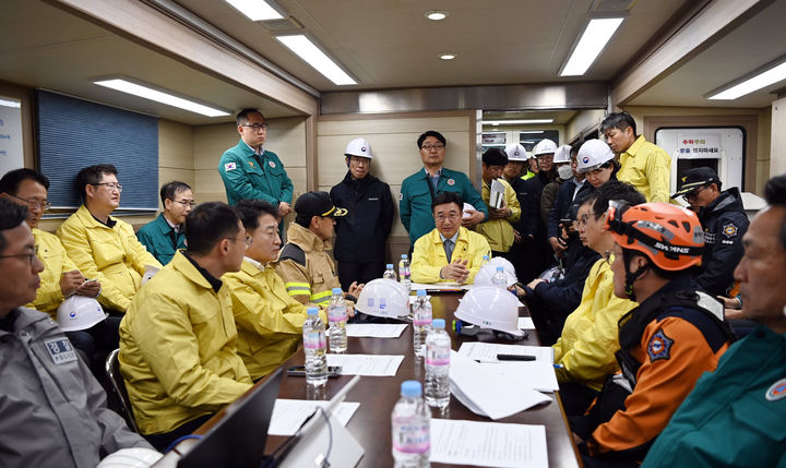 [서울=뉴시스] 최동준 기자 = 윤호중 행정안전부 장관이 7일 울산 남구 화력발전소 매몰사고 현장을 방문해 구조 상황 점검을 하고 있다. (사진=행정안전부 제공) 2025.11.09. [email protected] *재판매 및 DB 금지